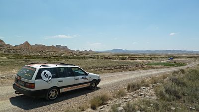 Leider steht heute unsere letzte Etappe an. Zuerst geht es zum Nationalpark Bardenas Reales, eine ca. 42.500 ha große Halbwüste, die von der UNESCO zum Biosphärenreservat erklärt wurde. Hier wollten wir uns eigentlich mit den anderen Teams treffen. Wir warten und warten ... fahren langsam weiter, aber weit und breit keine anderen Teams in Sicht ... später erfahren wir, dass sich ein Team die Ölwanne aufgerissen hat.