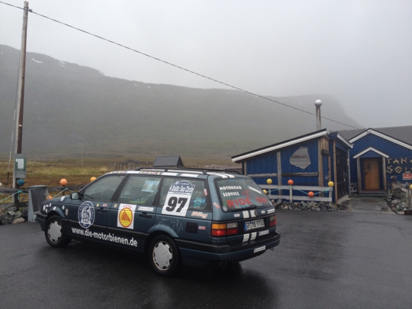 Als wir sehen, wie ein anderes Team zu dem Globus fährt, überlegen wir nicht lange und machen es ihnen frech nach. Rennen zu unserem Rallye-Passat, fahren zurück bis zum Eingang des Nordkaps, wenden an dem Kassenhäuschen und fahren verbotener weise Richtung Globus. Wir handeln uns zwar eine kleine Rüge ein und werden höfflichst gebeten, unser Foto zu machen und dann den Platz zu verlassen, aber egal wir haben unser Foto.