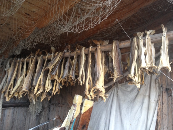 Weiter unterwegs zum Nordkap kaufen wir Briefmarken für 1,80 EUR/Stück und probieren getrockneten Stockfisch.