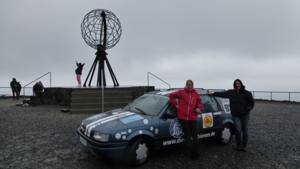 Als wir sehen, wie ein anderes Team zu dem Globus fährt, überlegen wir nicht lange und machen es ihnen frech nach. Rennen zu unserem Rallye-Passat, fahren zurück bis zum Eingang des Nordkaps, wenden an dem Kassenhäuschen und fahren verbotener weise Richtung Globus. Wir handeln uns zwar eine kleine Rüge ein und werden höfflichst gebeten, unser Foto zu machen und dann den Platz zu verlassen, aber egal wir haben unser Foto.